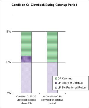 We believe that a Condition (C) clawback is rarely contained in the partnership agreements because: (1) very few investors request Condition (C) (and so, the pressure from limited partners to include this clawback is low) and (2) the financial benefits from this change are only realized if the fundʼs ultimate IRR is within a narrow band (i.e., above 8%, but below the point at which the general partner has fully "caught up"). We hope that by increasing awareness of the fact that the clawback should also apply to Condition (C), more investors will request this provision and — consequently, more funds will expand their clawback to include this scenario.